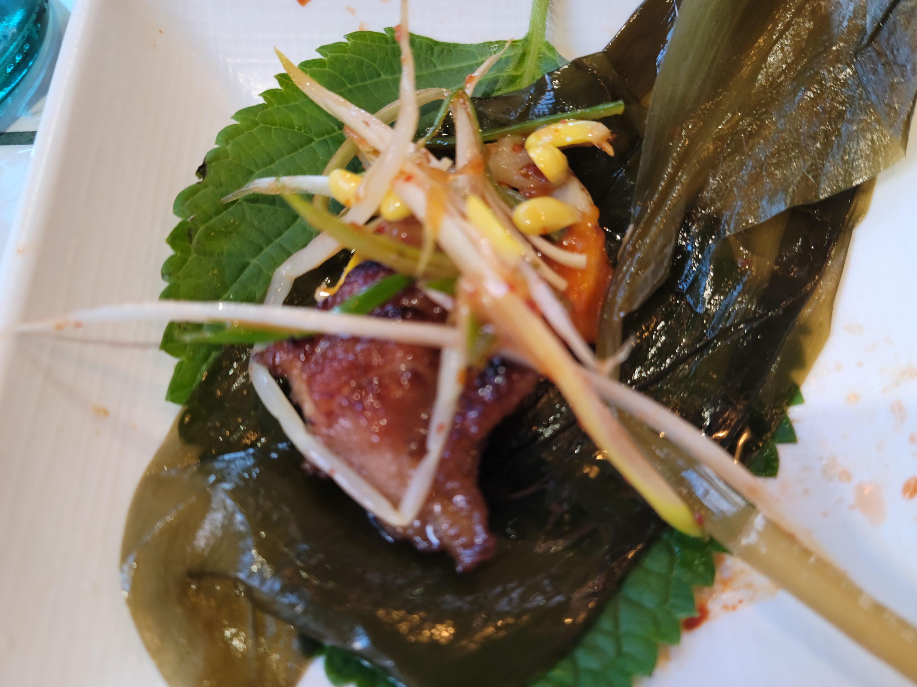 명이나물, 양념게장 등이 나오더니 잘 굽힌 고기와 쌈을 싸 먹을 수 있게 상추와 깻잎, 고추가 바로 뒤 따라 나온다.