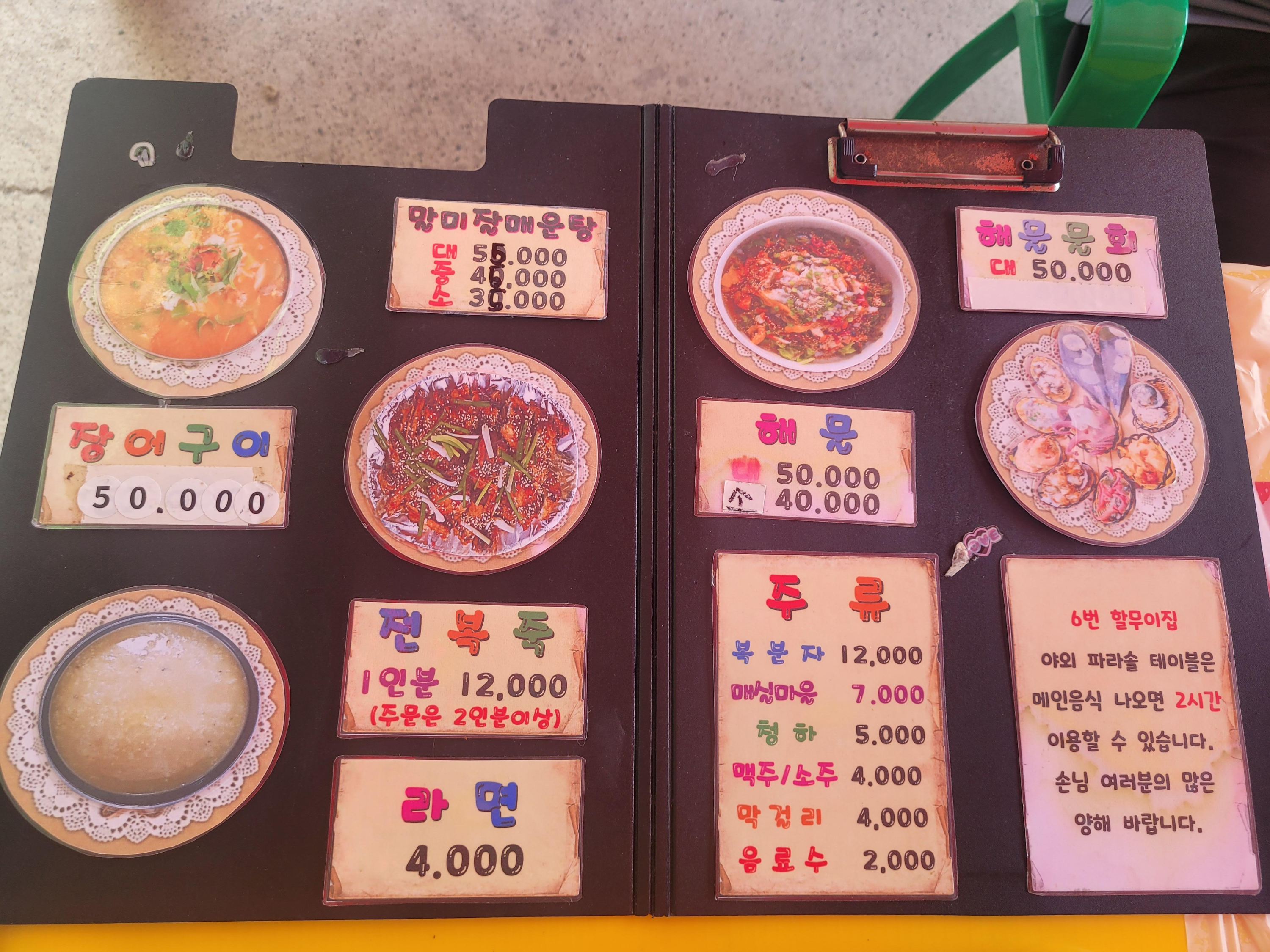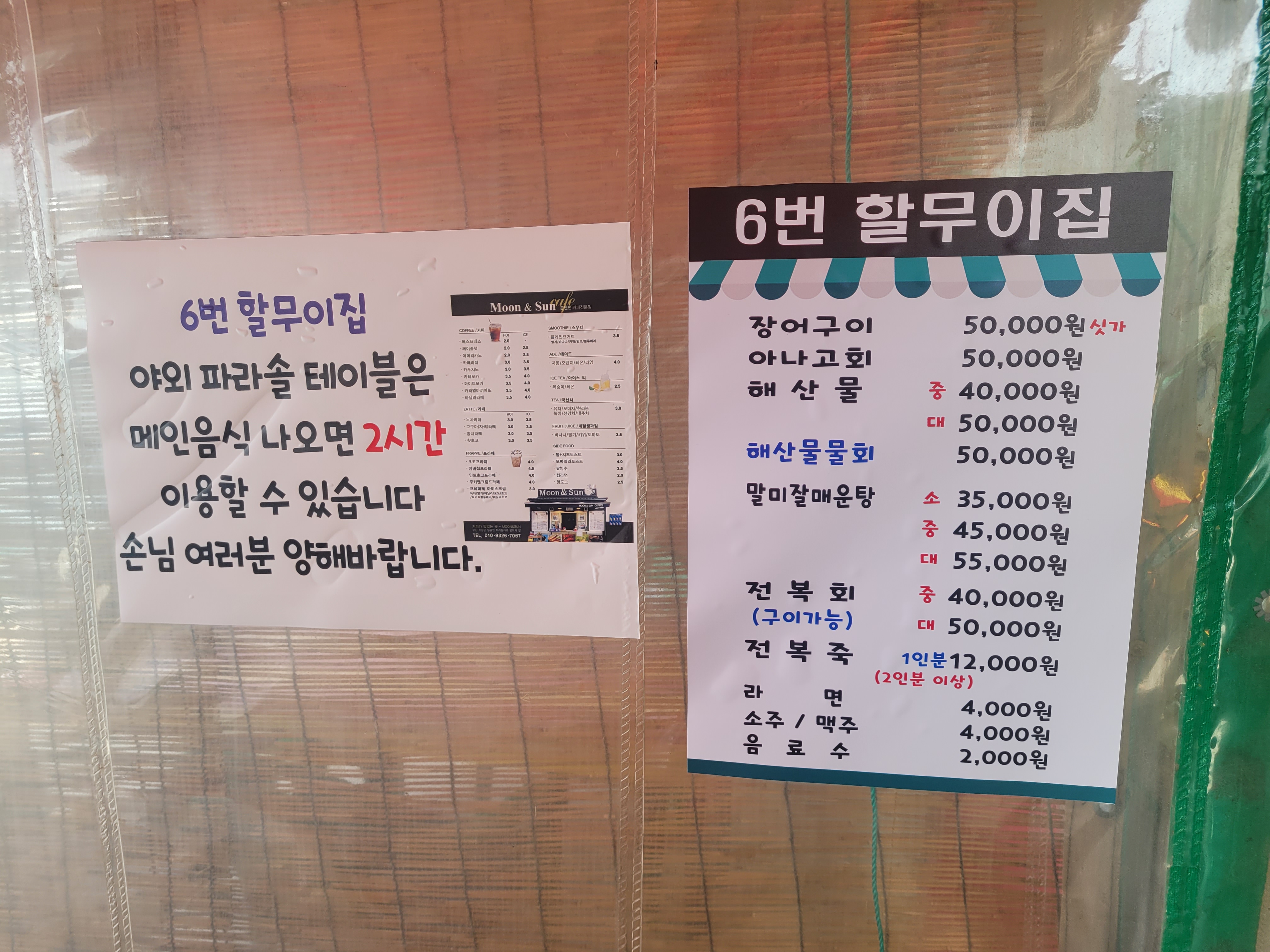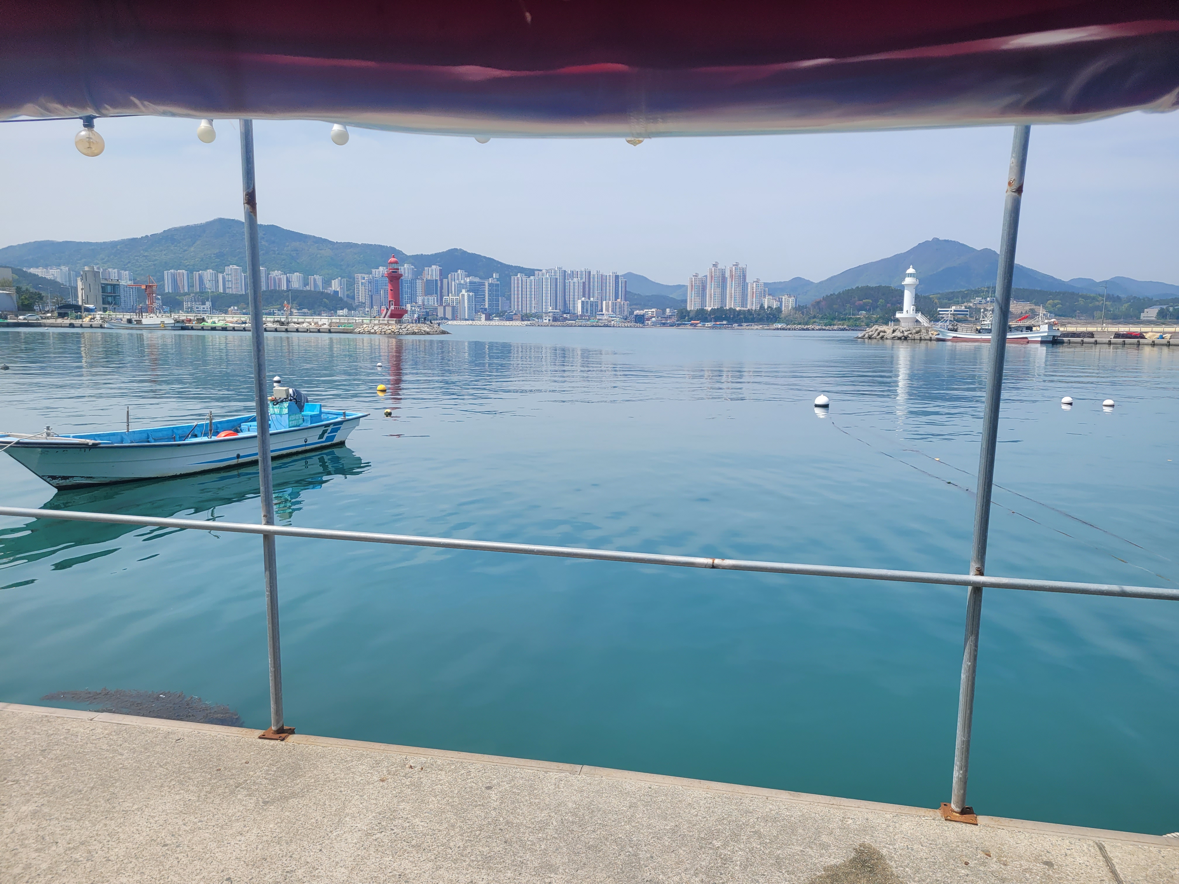 음식이 아무리 맛나다고 해서 아무 곳이나 앉아먹을 수 없는 일이라 ㅋㅋㅋ 우리는 식당 안쪽을 거부하고 역시 오션뷰가 보이는 천막이랄까? 아니면 포장타운이랄까? 아무튼 일광해수욕장이 보이는 식당 바깥쪽 천막으로 만들어진 식탁에 앉았다. 알고 보니 이 천막은 각 식당에 하나씩 관리하는 곳이었다 즉 식당 하나에 천막 하나라고 보면 될 것 같다. 저 멀리 일광해수욕장이 보이고 양쪽 가장자리에 등대가 우리를 호위하고 있는 모습이 참으로 좋았다. 일단 좋은 자리에 착석을 하였으니 무엇을 먹을까? 고민에 각자들 빠졌다 ㅎㅎㅎ
