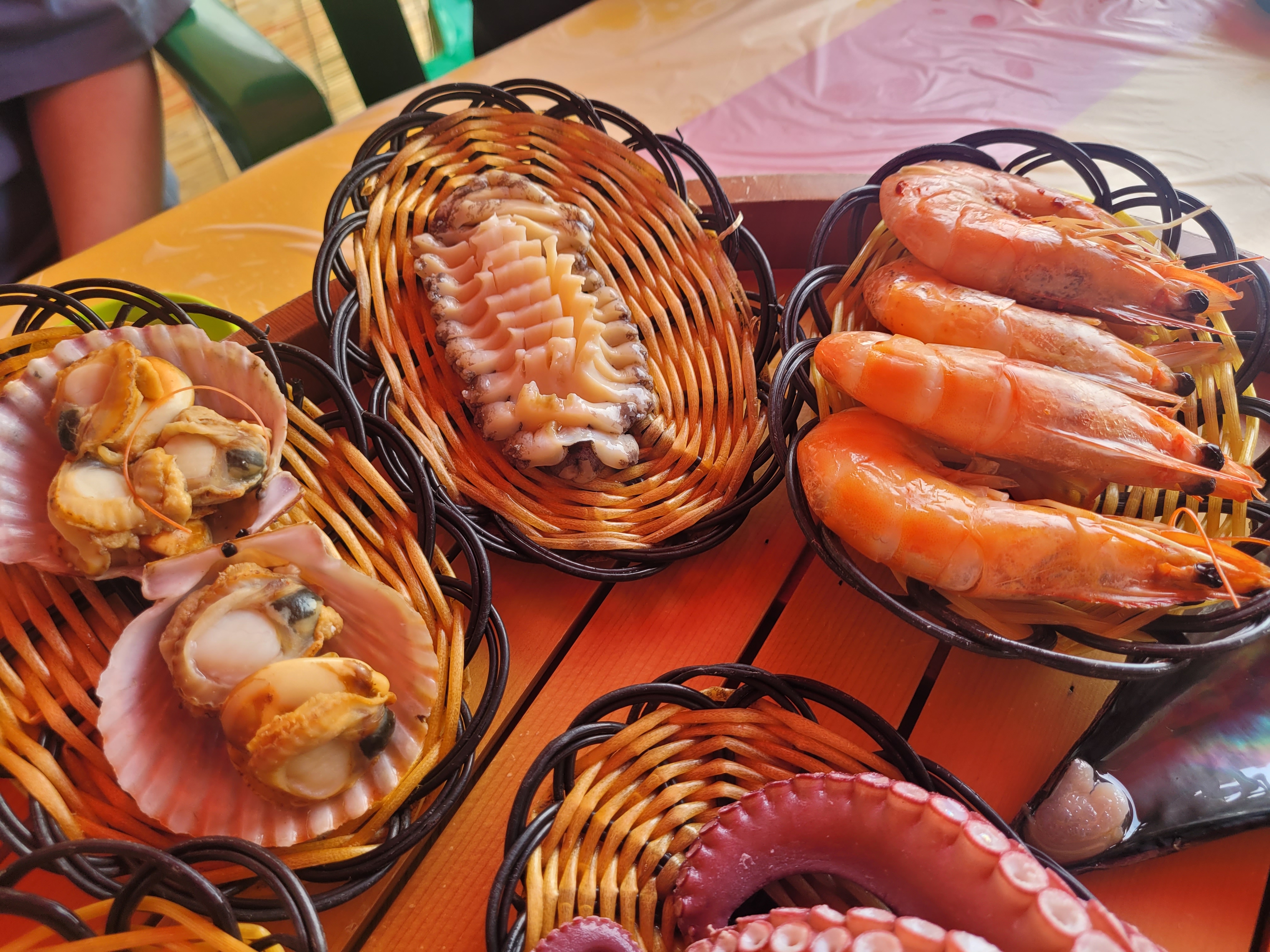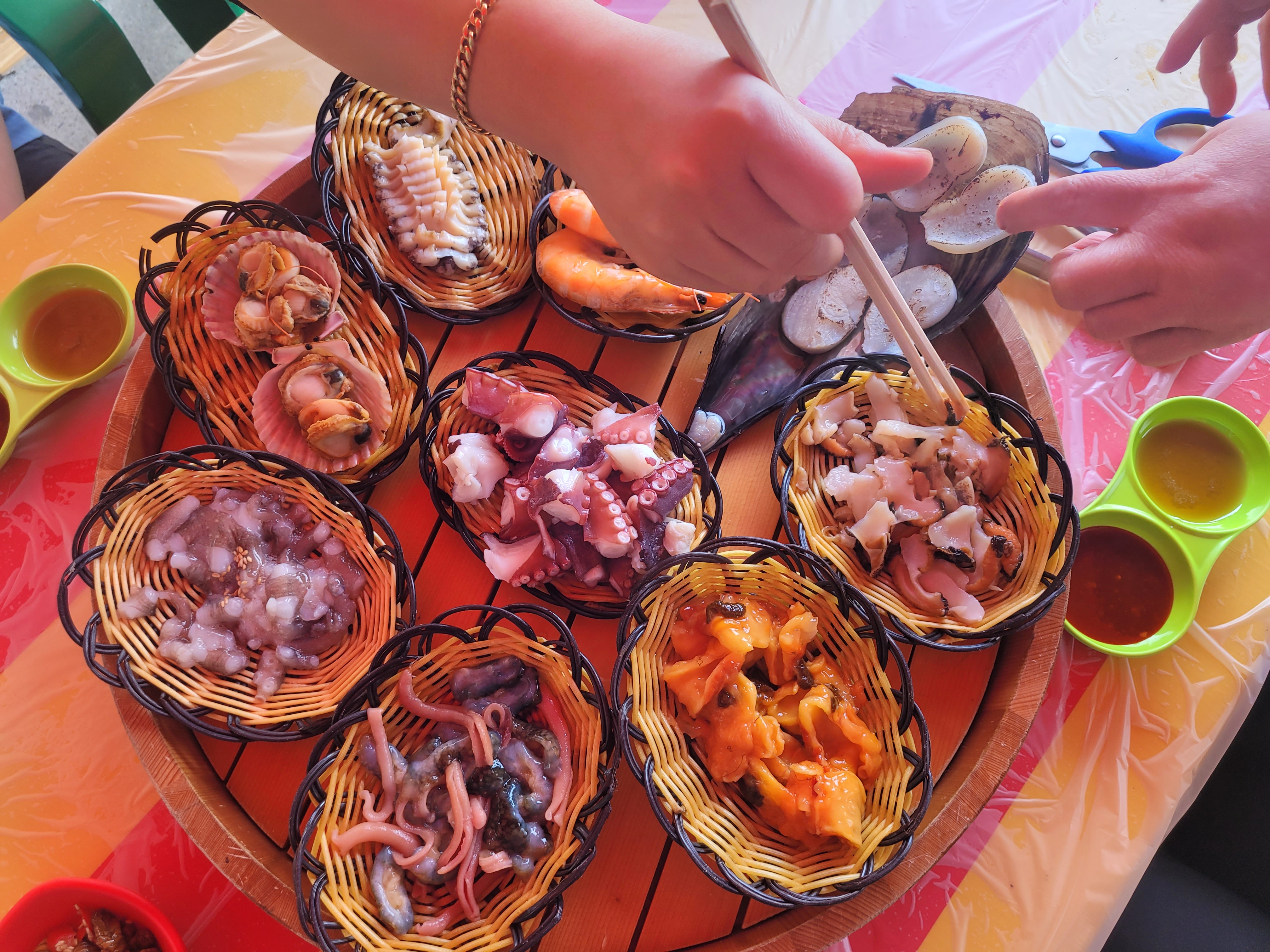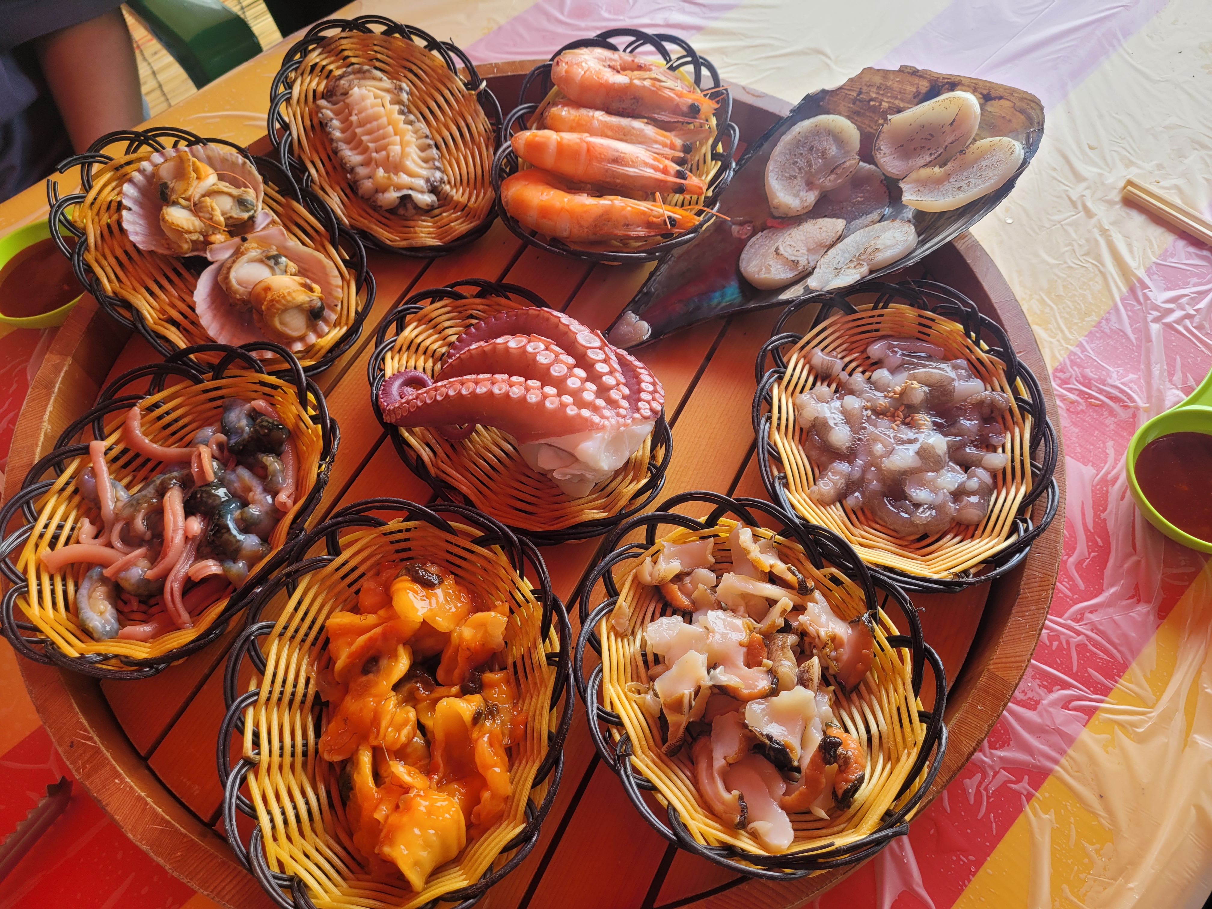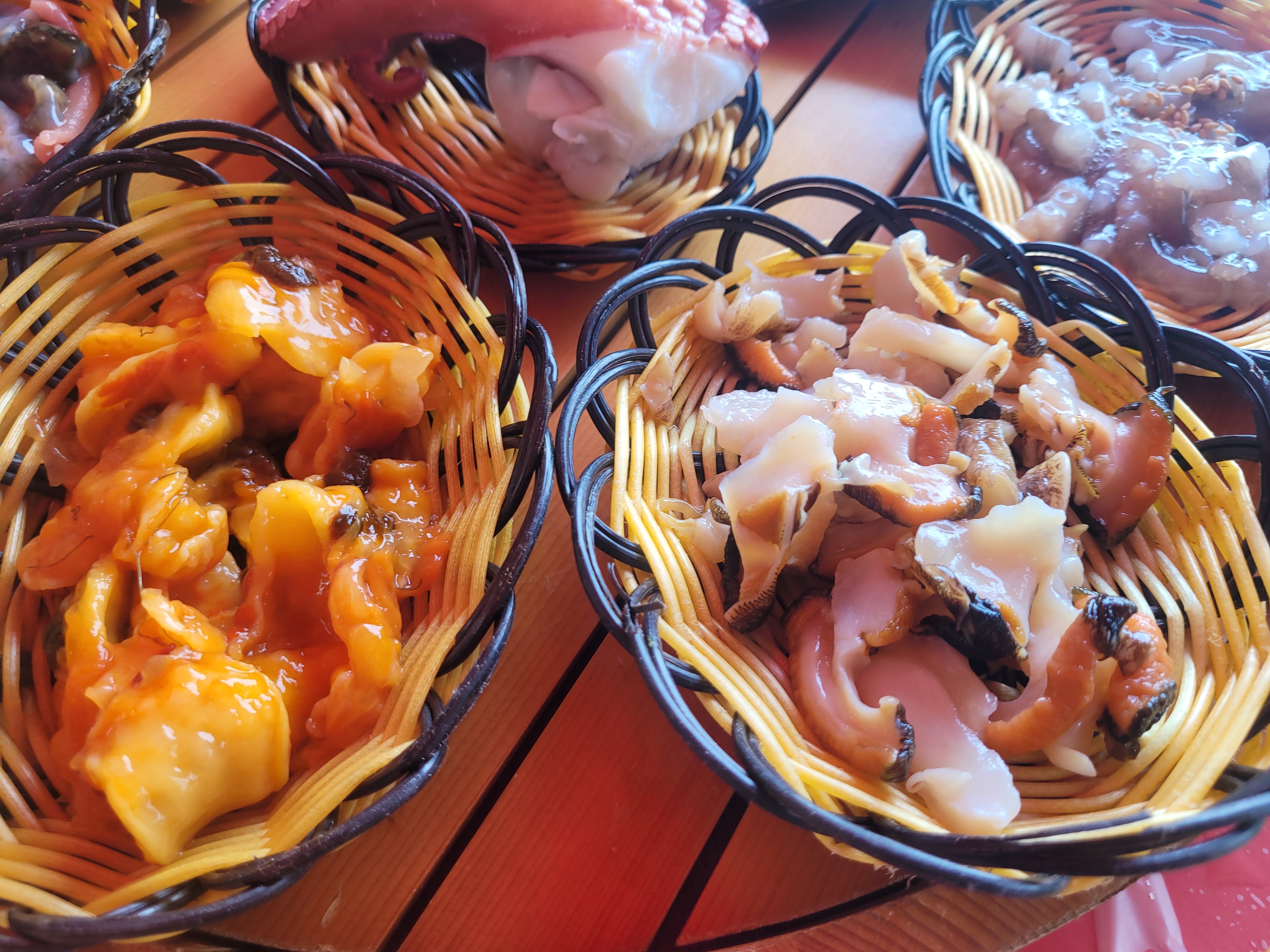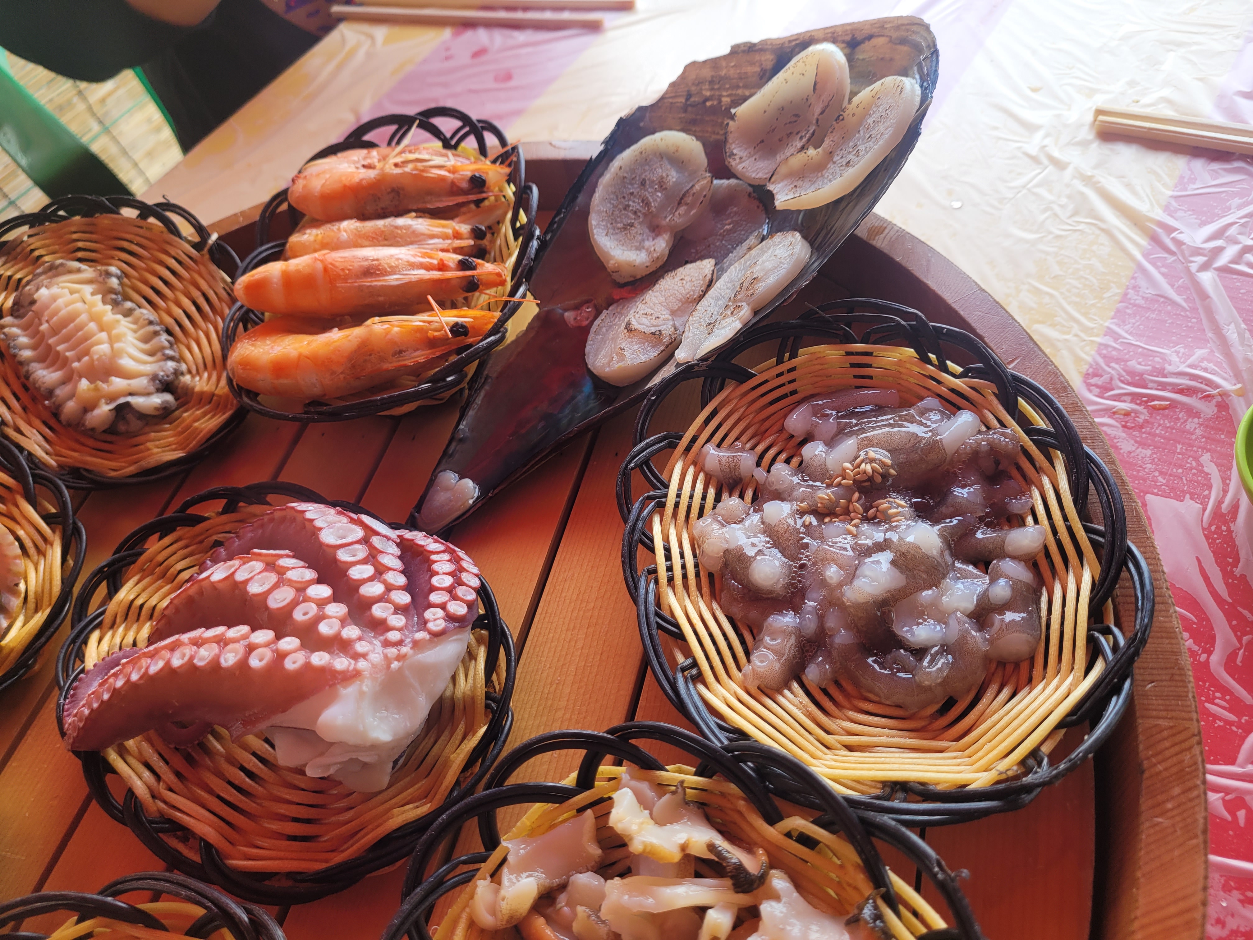 야외 파라솔 테이블은 메인 음식이 나오면 2시간을 이용할 수 있다는 안내문구를 보면서 우리의 입을 즐겁게 할 메뉴를 선택하였다. 아나고회와 해물을 시킨 우리들은 이제나 나올까 저제나 나올까? 젓가락만 흠신 빨아 되고 있었다. ㅎㅎ 점심 시간대라 그런지 참기가 엄청 힘들었든 것 같다. 몇 분이 흘러갔을까? 이제야 나왔다. 새우, 전복, 가리비, 문어, 개불, 낙지, 멍게, 해삼 등등 제법 예쁘게 나왔다. 일전에 방문한 옆집과는 조금 다른 음식이 있네요 아무튼 너무 맛있을 것 같아 사진 후딱 찍고 입으로 음식을 직행하였다. 바다를 보며 먹는 해산물 캬~~~ 죽인다.