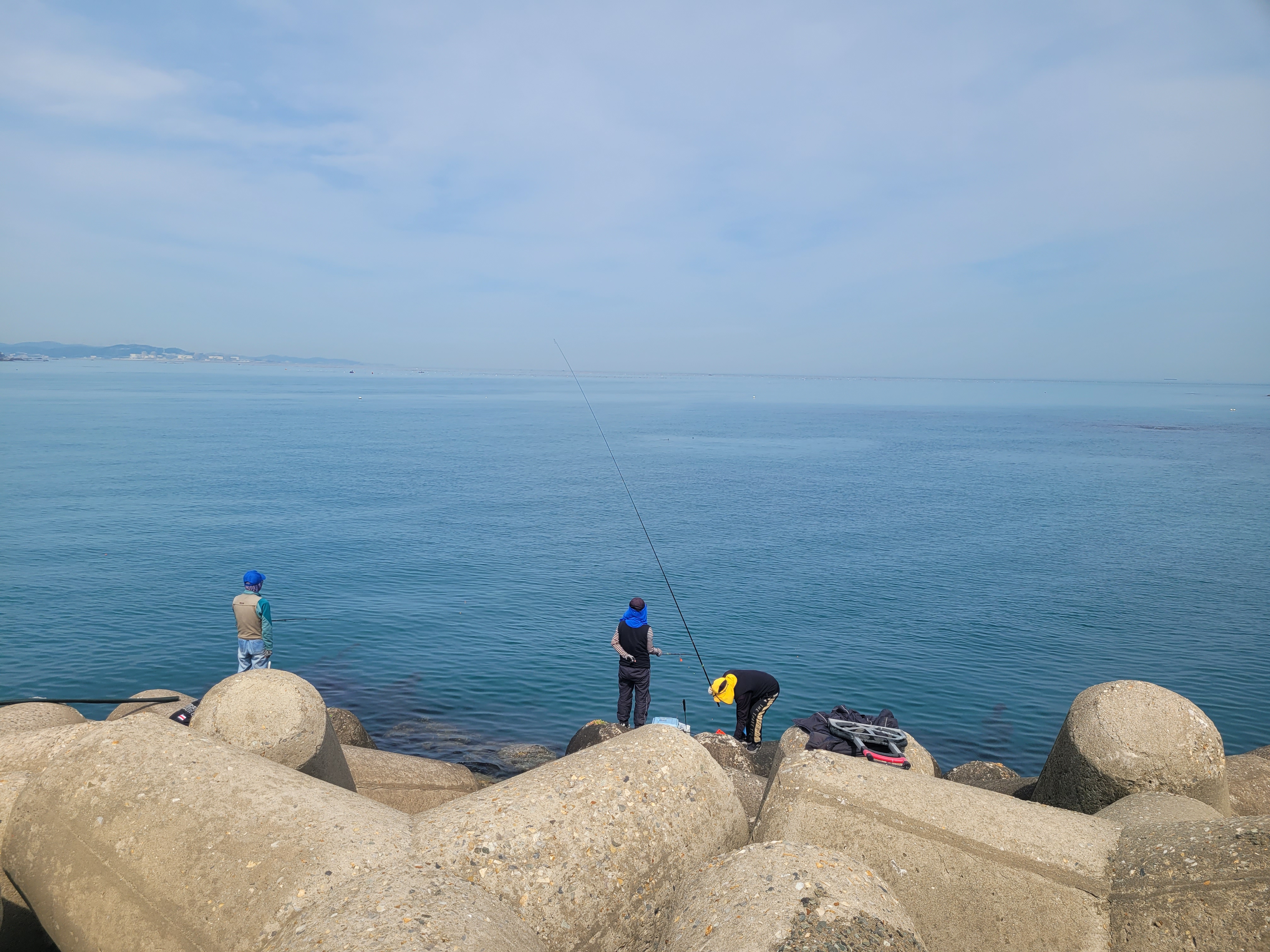 잠시나마 일광해수욕장을 구경하고 오른편 산 쪽으로 차량을 이동하였다. 역시나 얼마가지 않아 학리방파제 즉 우리의 목적지가 나타났다. 오늘은 방파제 주변 사람들이 제법 많이 보인다. 아니나 다를까 다들 바다낚시에 열중이다.