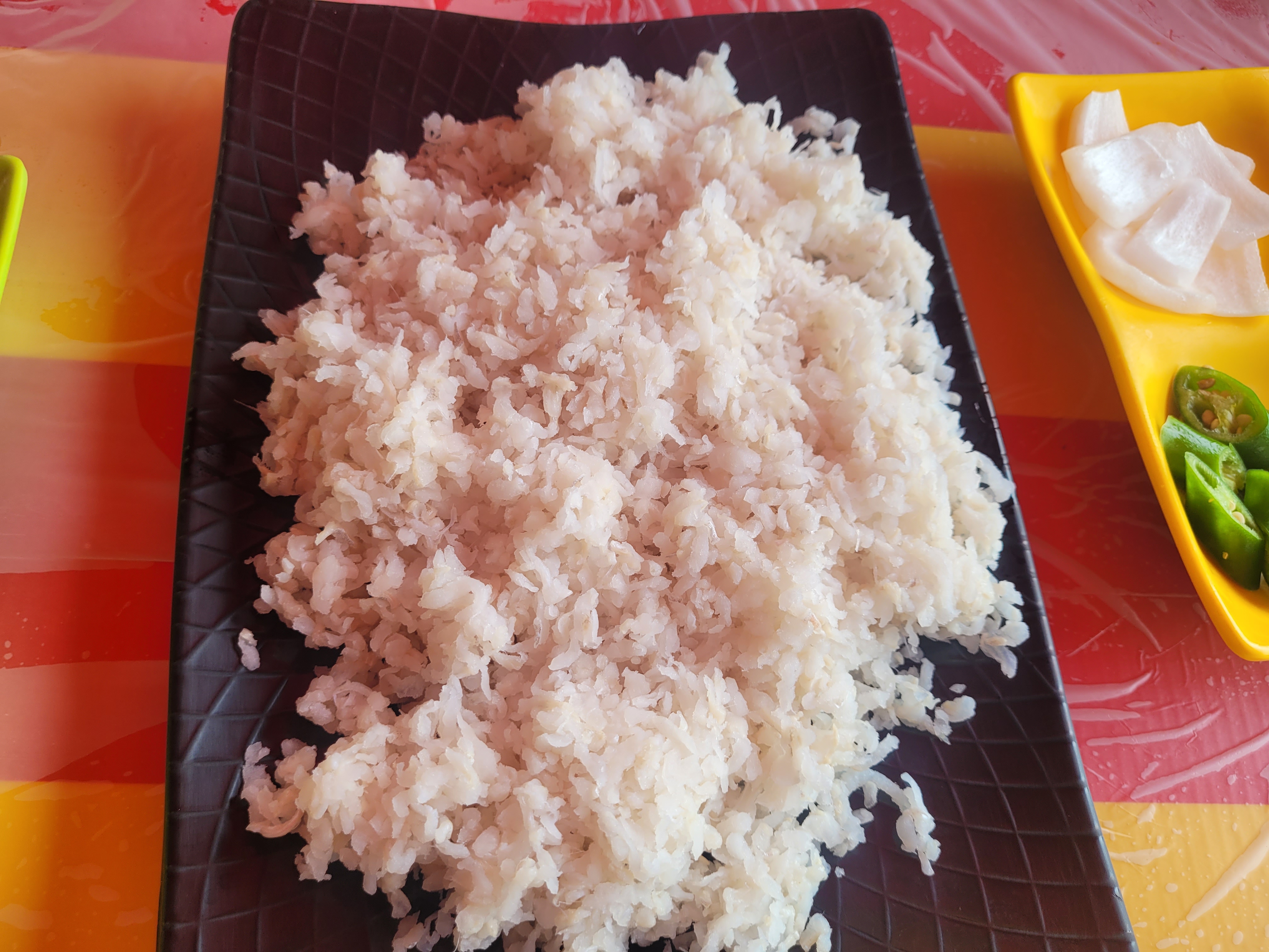 새우깡 선전도 아닌데 손이 가요 손이 가 해물모둠에 손이 가요~~~ 아이손 어른손 아니 젓가락 우리들은 서로 각자의 노래를 부르듯 흥얼되며 입으로 넣기 바쁘다. 좀 더 공평한 먹거리를 위해 가위로 한입정도로 만드는 작업은 필수인 듯하다. 이런 음식을 먹을 때면 항상 죄를 짓는 듯 소주를 먹어주지 않으면 안 된다. 그래서 사장님 소주 한병이요 라며 외치고 소주잔을 머리끝까지 올려 캬~~~라는 소리와 함께 안주가 입으로 쏘~~~ 옥 싱싱하고 참 맛나다. 이렇게 한잔 두 잔 한입 두 입 먹다 보니 붕장어회가 나왔다. 하얀 밥알이 살아있듯 아니 새하얀 눈을 한 접시가 나왔다.