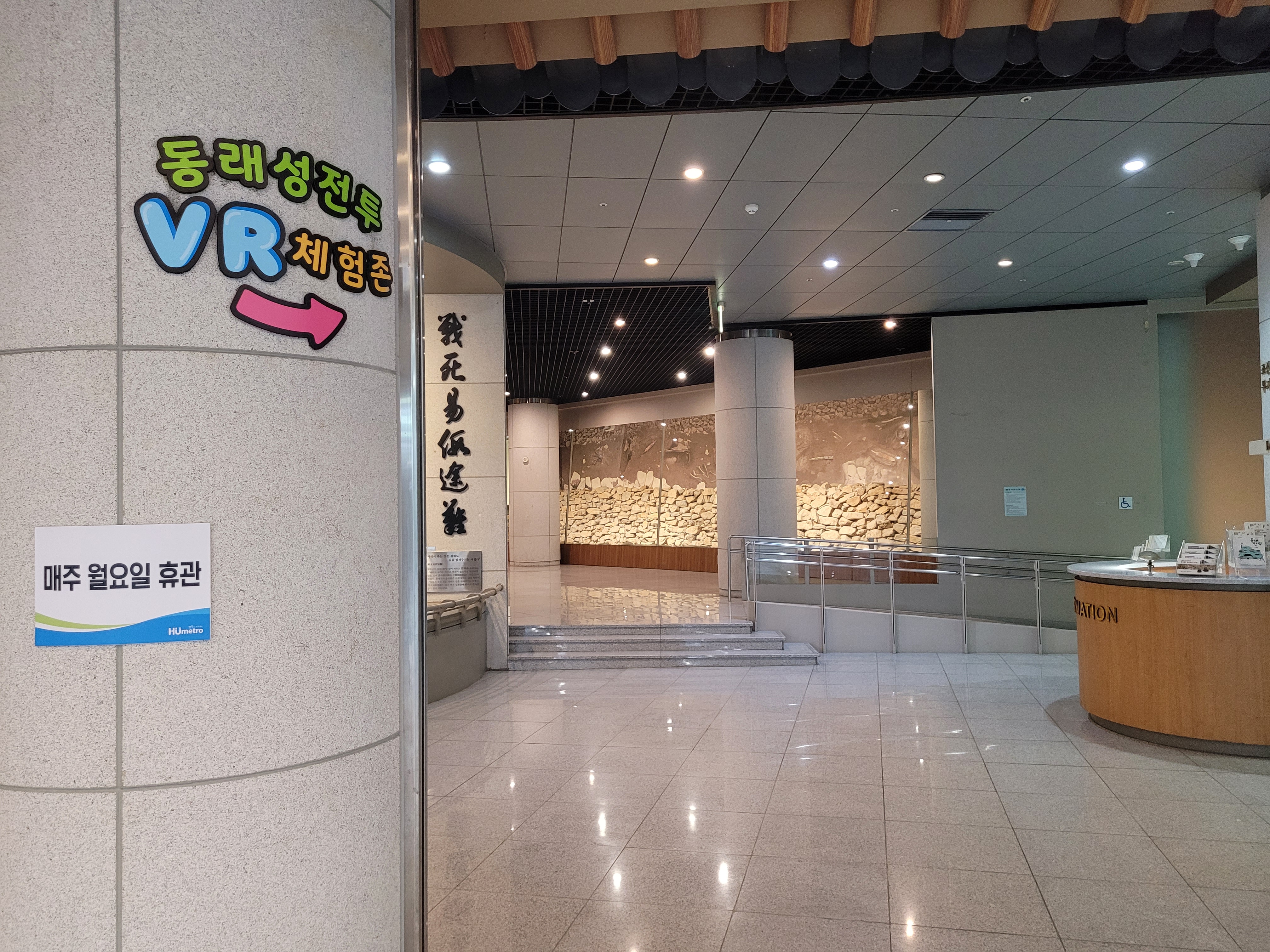 그나저나 우리들 중 한 명은 친구들과 놀이동산? 에 간다고 훌쩍 형을 놓아두고 지나친 즐거움을 찾으러 갔다. 그래서 우리 둘이는 이른 아침이라고 할 수는 없지만 지하철을 타고 지하철 여행을 하기로 했다. 뚜렷한 목적지는 없었지만 나름 재미를 느끼며 지하철을 타고 충렬사에 내려 구경을 하다 한걸음 한걸음 걷다 보니 어느덧 수안역에 도착을 하였다. 수안역사에 내려가 표를 끊으려고 하다 보니 헉 우리들 눈에 박물관 같은 구조물이 보였다 바로 "동래읍성 임진왜란 역사관"이었다. 박물관이리라고는 할 수 없을 정도로 아주 작은 공간이긴 하나 그래도 궁금증이 폭발한 나머지 안쪽으로 돌격하였다.