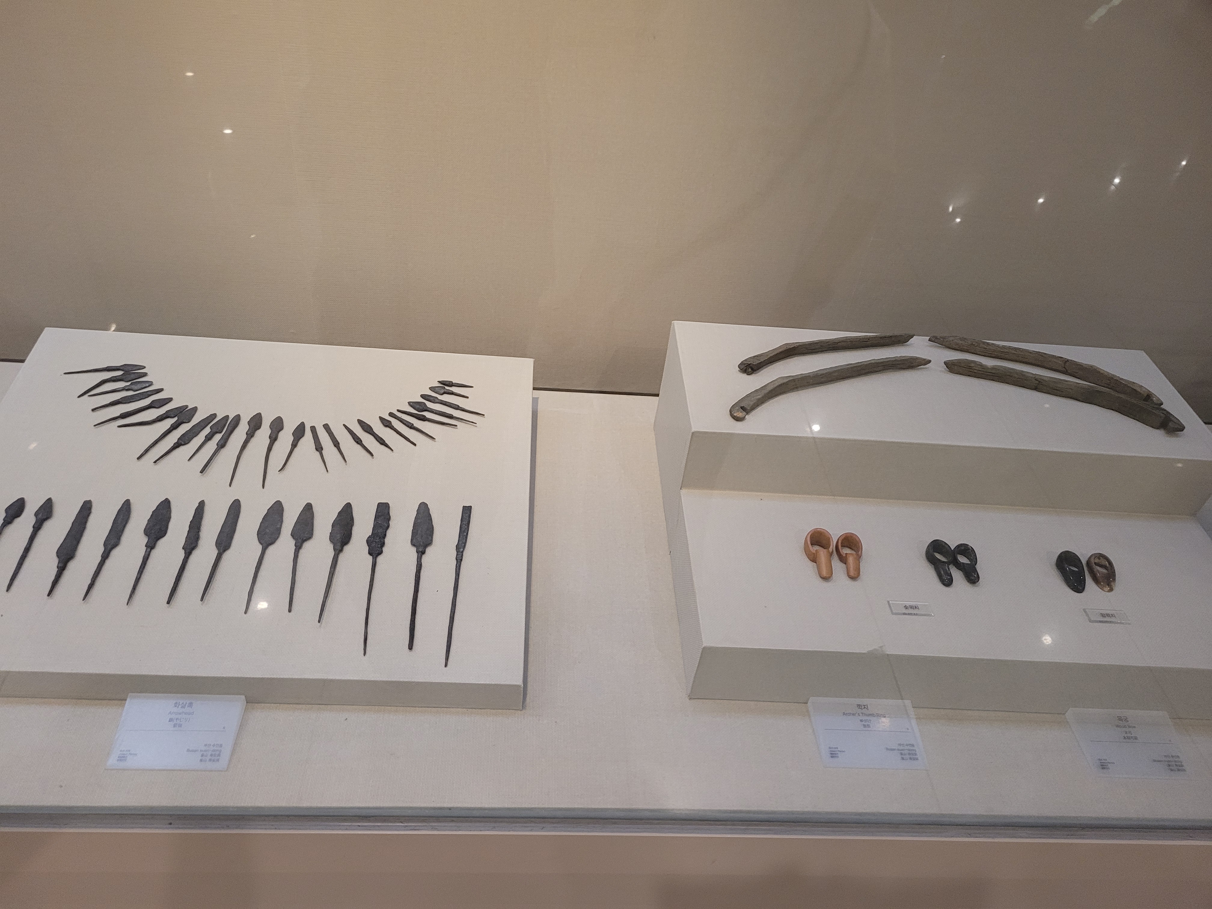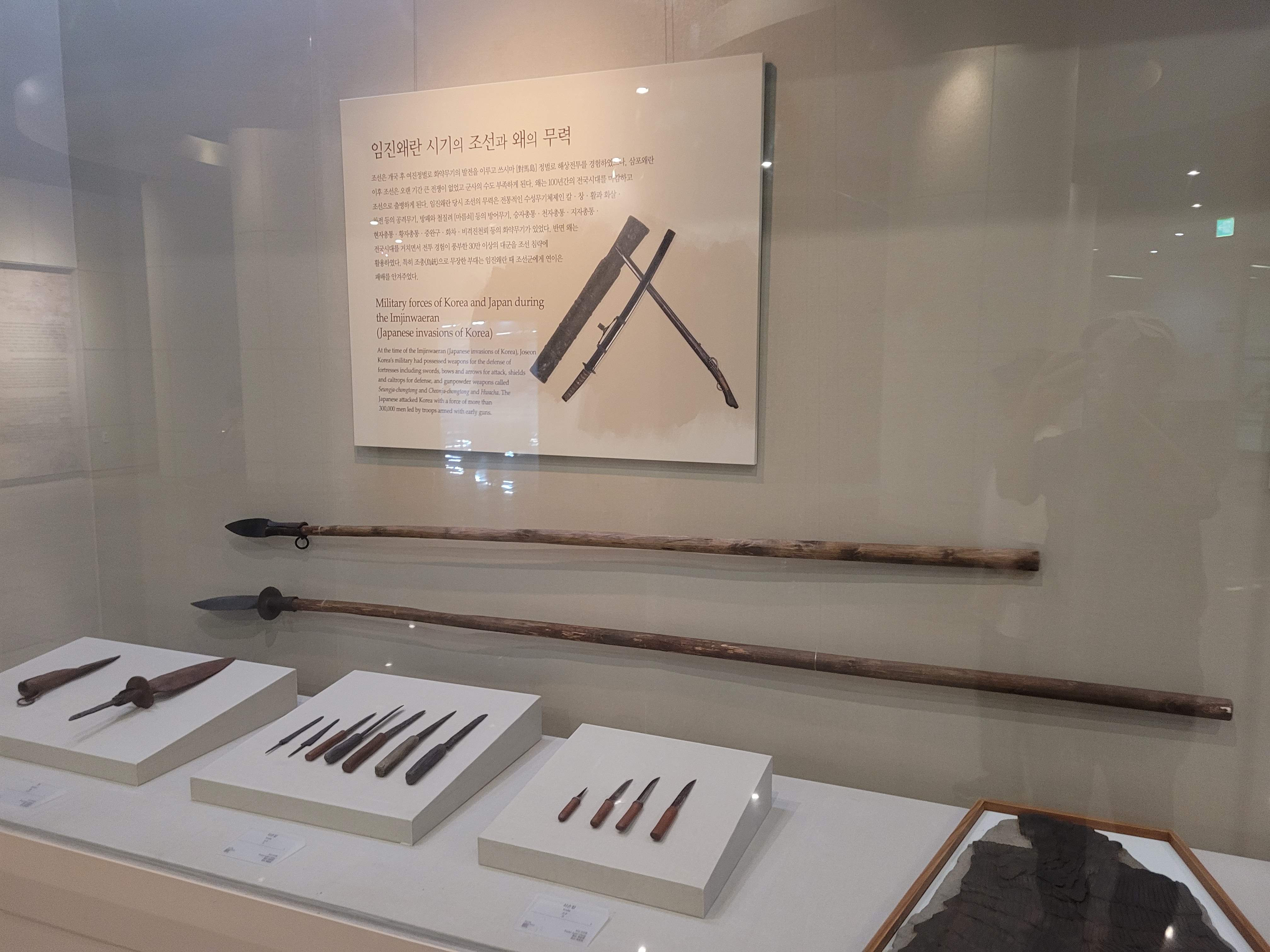 그리고 바로 옆에는 긴 창이 우리들 눈에 보인다. 또 왜군의 침입에 대항하면서 사용된 것으로 추정이 되는 칼, 쇠손칼 등의 유물이 보인다.