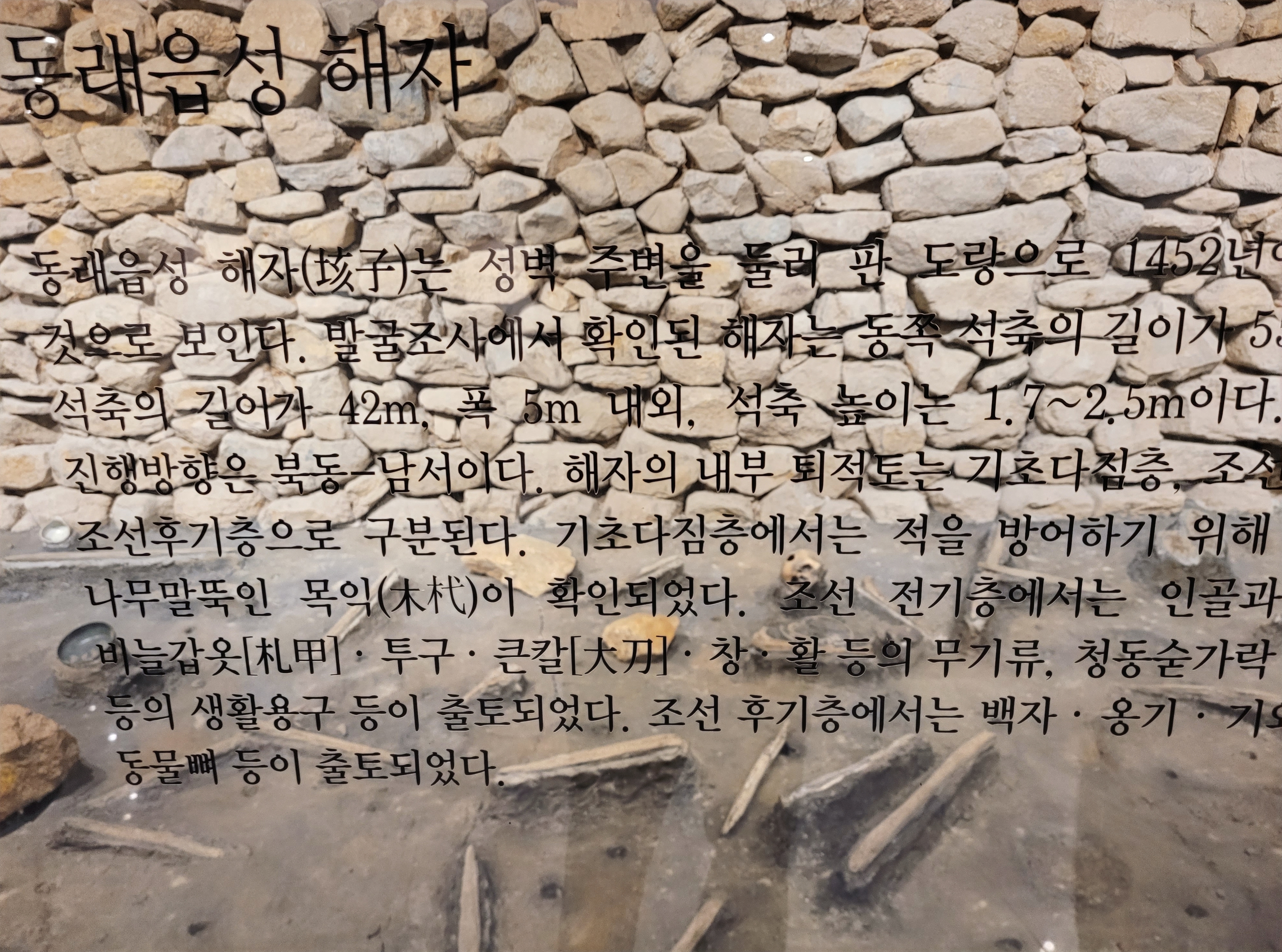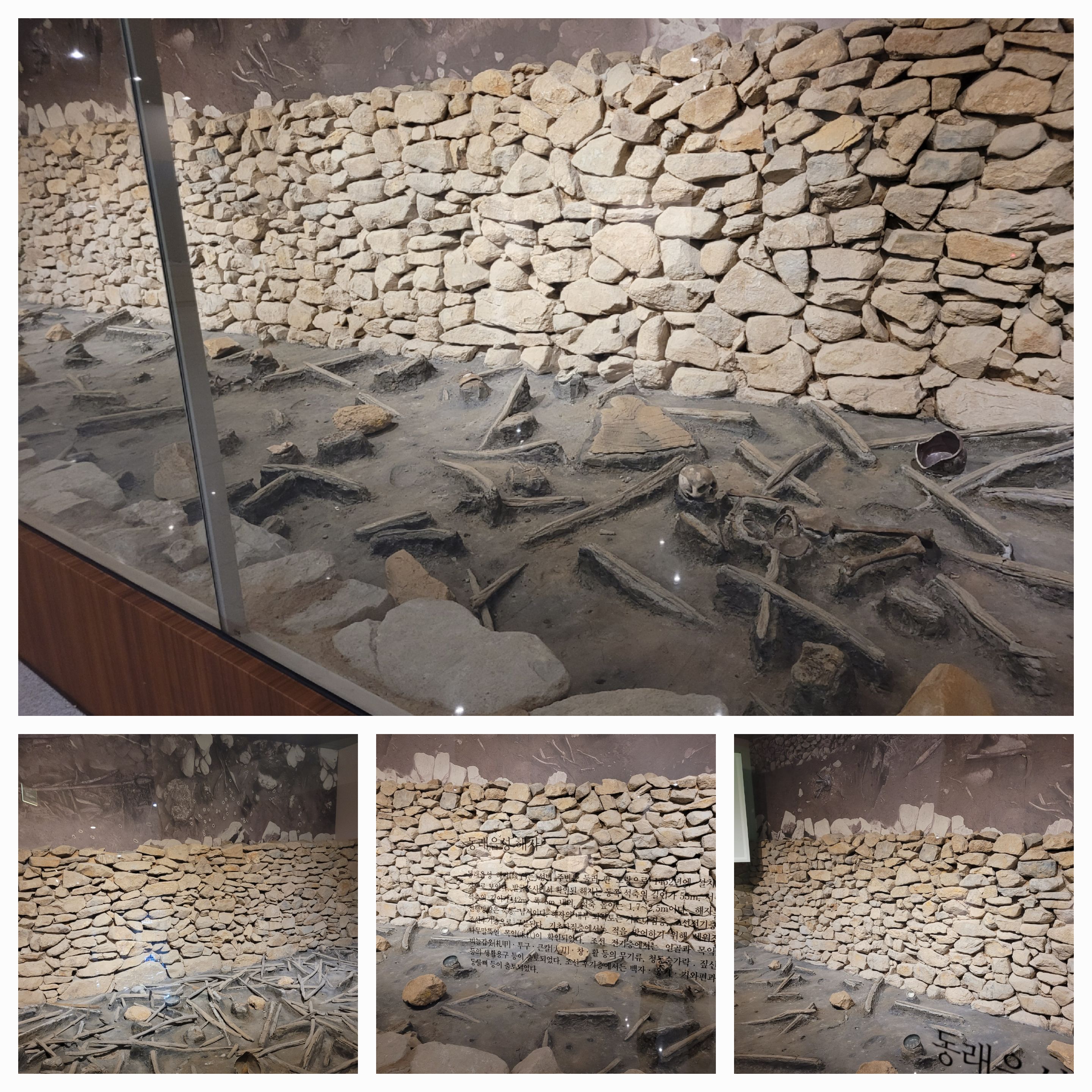 아쉽지만 VR체험존을 지나 또 한걸음을 옮겼다. 헉 이것은 무엇일까? 작은 돌로 벽을 인테리어 해놓은 것 같다 그런데 바닥에는 해골은 물론 사람들 뼈처럼 보이는 것이 즐비하게 흩어져 있다. 아이는 이게 무엇인지를 묻지만 나는 한참을 이야기해 줄 수가 없었다. 그러나 이리저리 유리창 너머 관람을 하는 순간 전시관 유리에 "동래읍성 해자"라고 쓰인 글을 발견하고 이를 읽어 주었다. 이에 내용은 다음과 같다. 동래읍성 "해자"는 성벽에서 30m 덜어져 축조되었으며 석축은 13~14단 정도로 폭은 5m 높이는 1.7~2.5m로 되어있다. 해자 내부에는 임진왜란 때 동래읍성전투의 참상을 보여주는 칼에 베이거나 두개골에 구멍이 난 인골과 칼, 목궁, 화살촉 등의 무기류가 출토되었다고 한다.